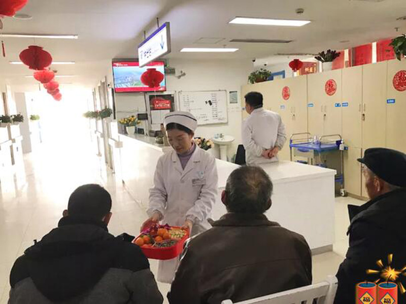 为了营造春节气氛,医院值班医护人员在病区挂起灯笼、贴上福字等新春饰品,让病人在医院感受到家的温暖,也能感受到浓浓年味。同时还准备了水果、瓜子、花生、小礼品,与住院患者一同观看春节联欢晚会,共同迎接新年的到来,病房里到处呈现出欢快、祥和、喜庆的节日气氛.